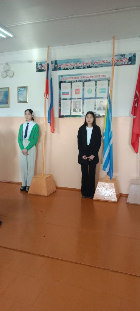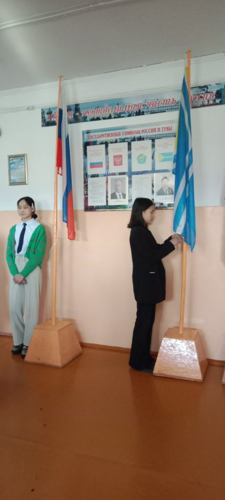 Право поднять флаг предоставлено учащимся Сереп Олча, 8класс (ударница по итогам 3 четверти) и Доржу-оол Камилла, 9класс (Призер Первенства РТ по дзюдо в марте). #ГимныРФиРТ #ЦеремонияПоднятияФлагов