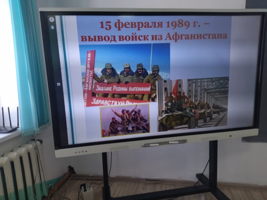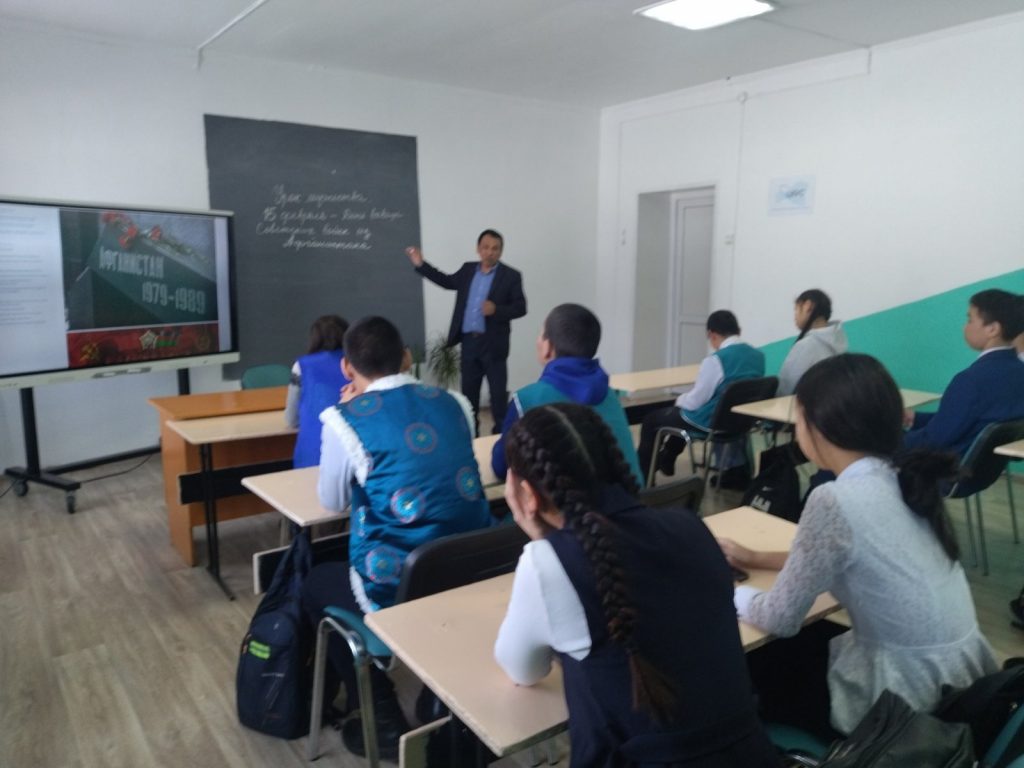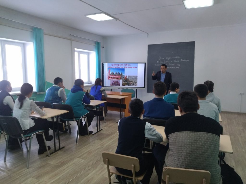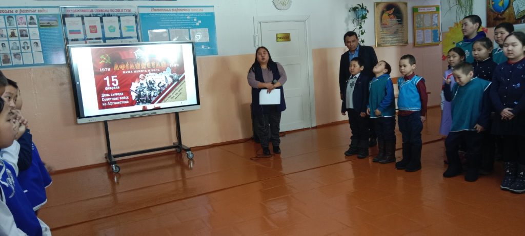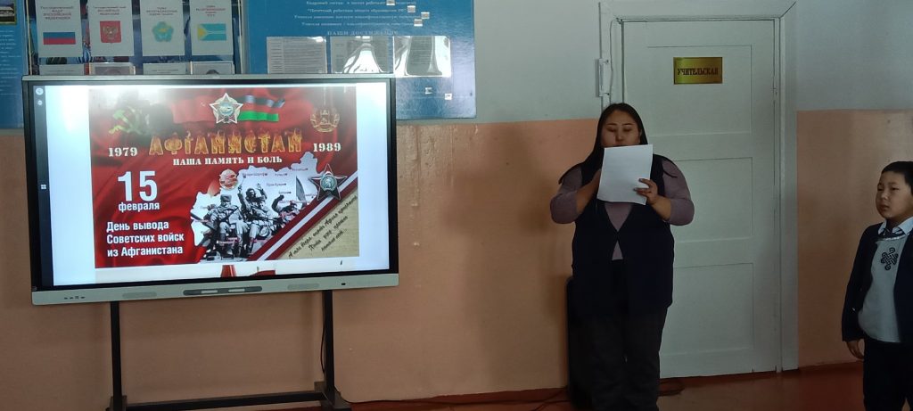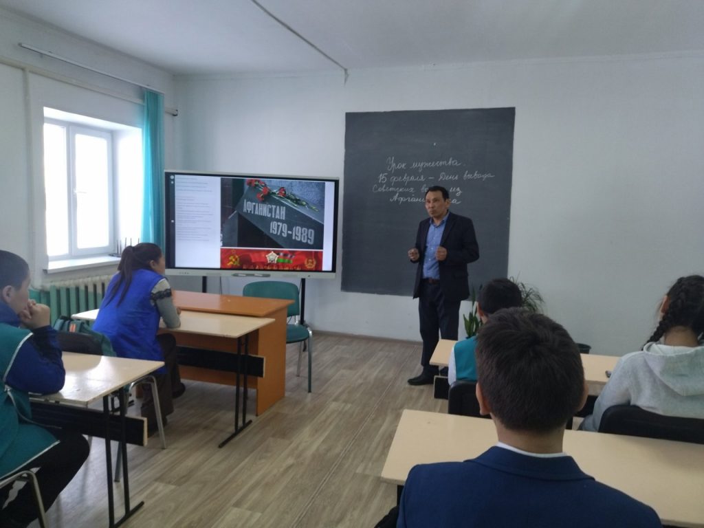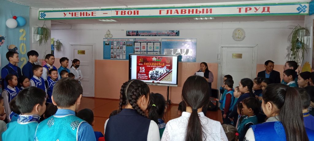15 февраля педагогом-организатором ОБЖ Сендажы А.О. и социальным педагогом Балдан А.С. для учащихся средних классов был проведен Урок Мужества на тему «Никтор не забыт, ничто не забыто», посвященный к 34-летию вывод войск из Афганистана.