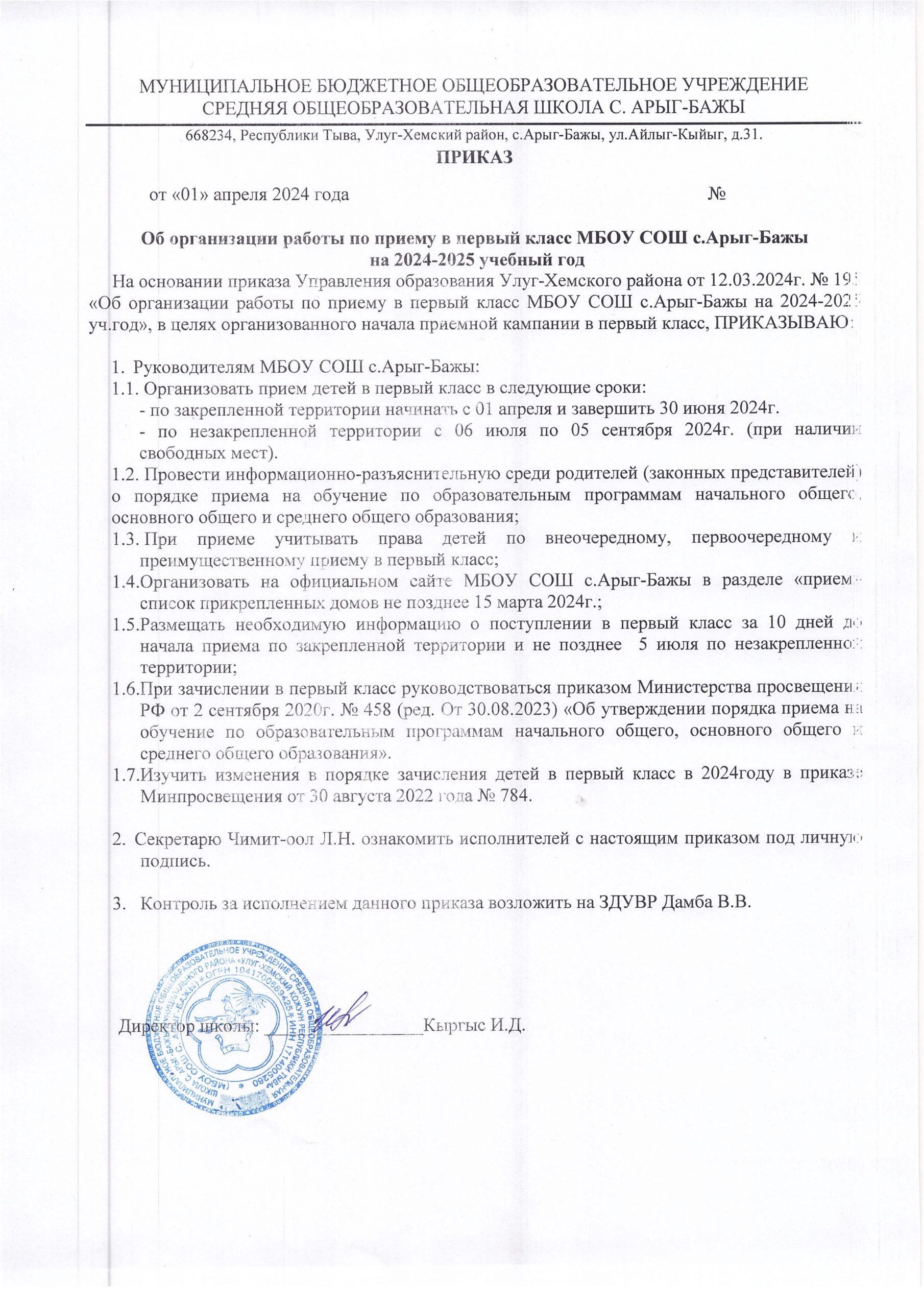 На территории Республики Тыва в образовательных организациях с 01 апреля 2024 года начинается кампания по приему в 1 класс