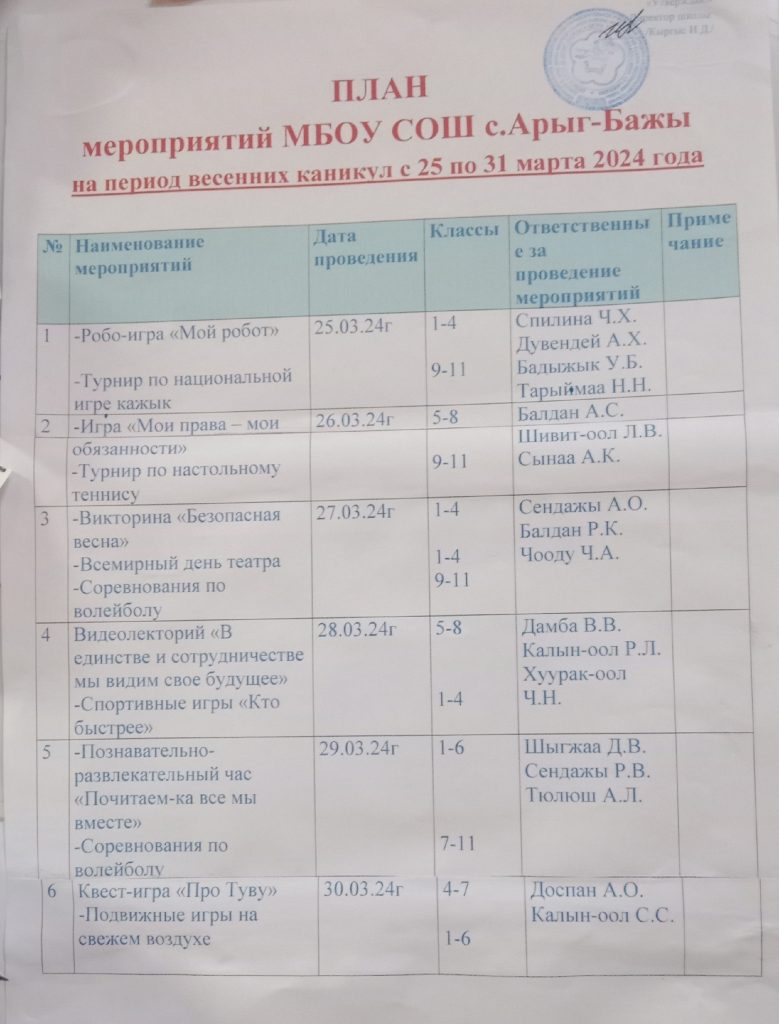 Уважаемые родители, дети! В период летних каникул в школе будет организована летняя оздоровительная кампания. Дети будут охвачены в два сезона, первый сезон с 3 по 25 июня 2024года, а второй — с 27 июня по 17 июля 2024года. Уважаемые родители, призываем Вас приобрести путевпи для своих детишей на первый и второй сезоны, места ограничены. За дополнительной информацией обращайтесь по тел. 89016443197, начальник лагеря Спилина Челээш Хереловна.